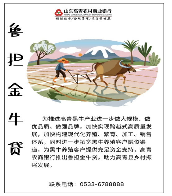 为推进高青黑牛产业进一步做大规模、做优品质、做强品牌,加快实现跨越式高质量发展,加快构建现代化养殖、繁育、加工、销售体系,同时进一步拓宽黑牛养殖客户融资渠道,为黑牛养殖客户提供充足资金支持,高青农商银行推出鲁担金牛贷,助力高青县乡村振兴发展。