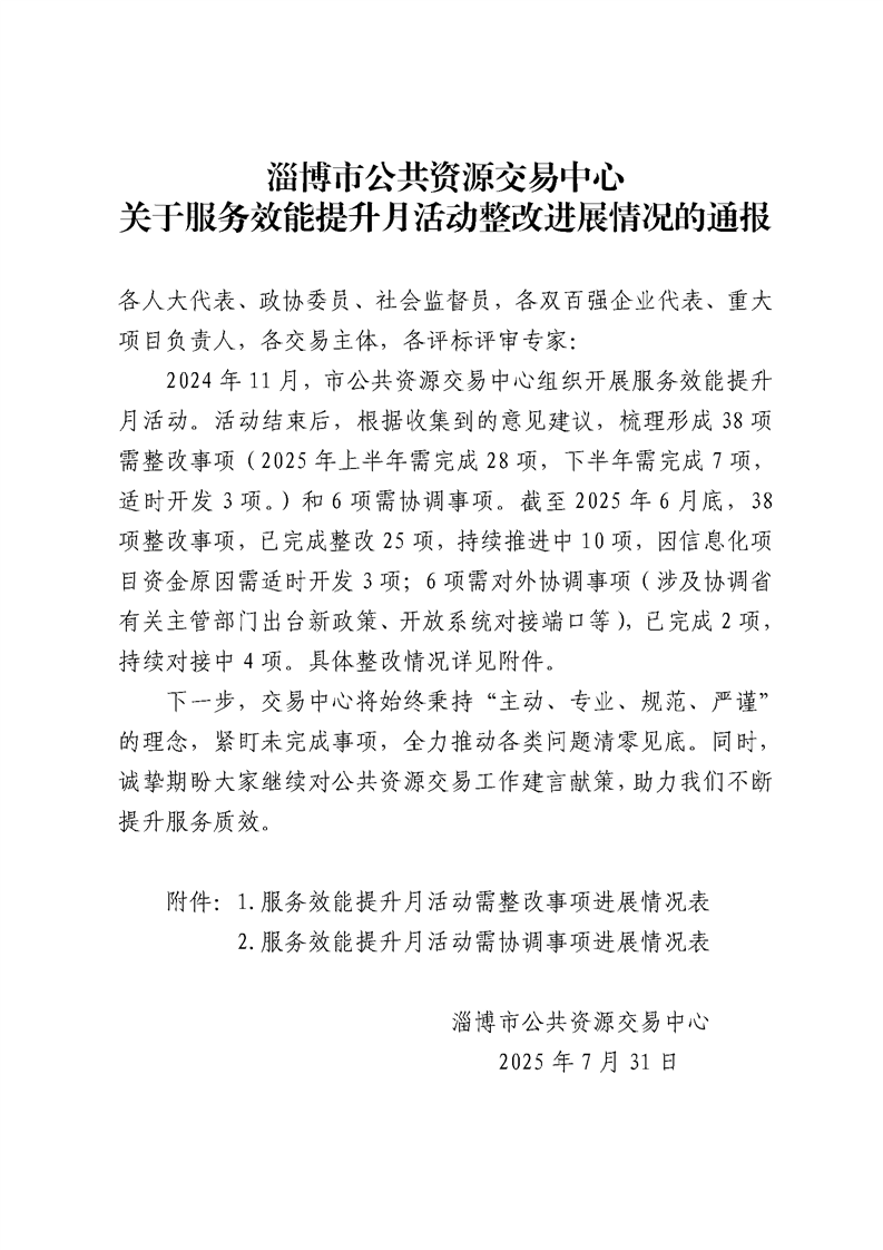 淄博市公共资源交易中心关于服务效能提升月活动整改进展情况的通报