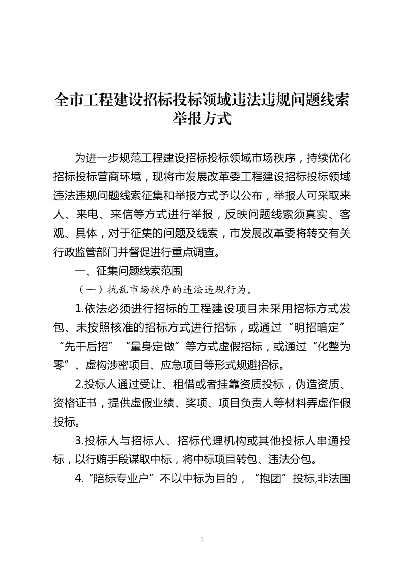 全市工程建设招标投标领域违法违规问题线索举报方式