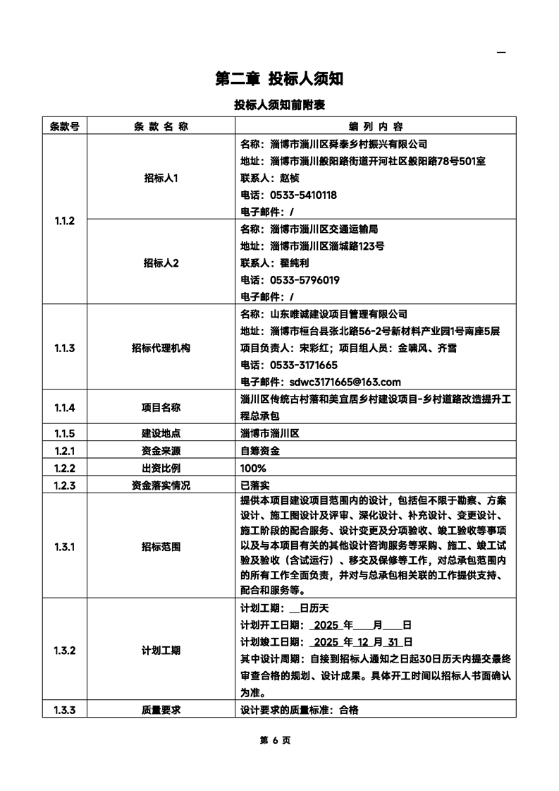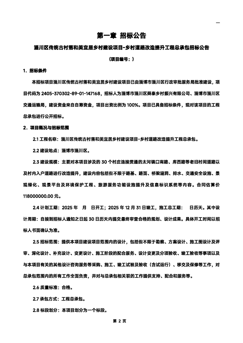 淄川区传统古村落和美宜居乡村建设项目-乡村道路改造提升工程总承包招标文件预公示