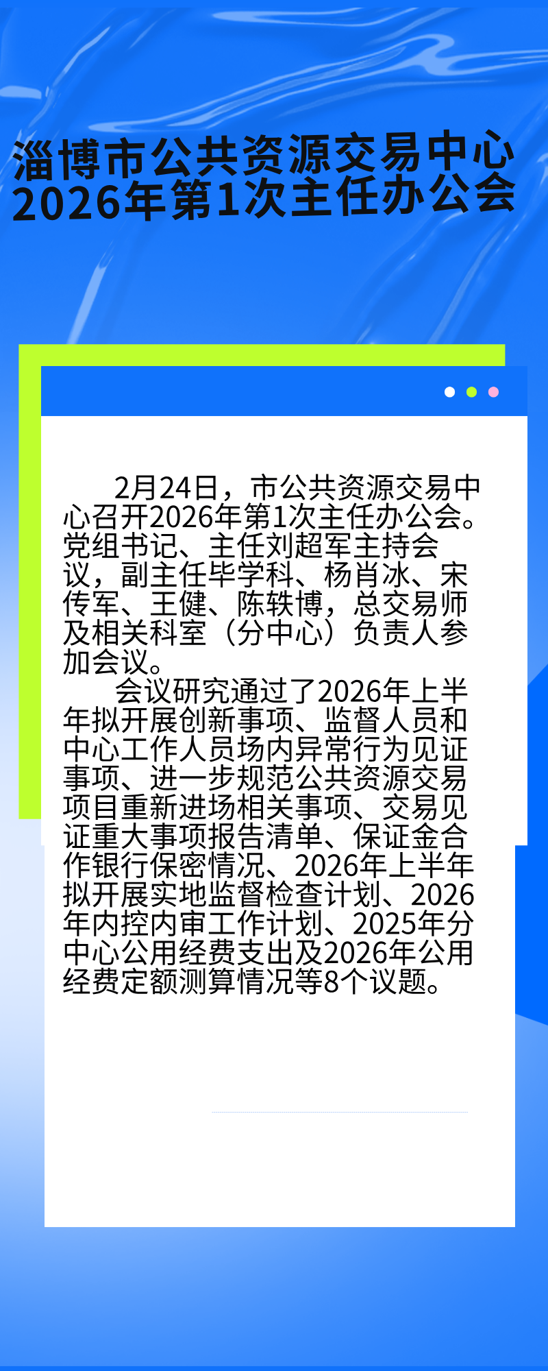 会议研究通过了2026年上半年拟开展创新事项、监督人员和中心工作人员场内异常行为见证事项、进一步规范公共资源交易项目重新进场相关事项、交易见证重大事项报告清单、保证金合作银行保密情况、2026年上半年拟开展实地监督检查计划、2026年内控内审工作计划、2025年分中心公用经费支出及2026年公用经费定额测算情况等8个议题。
